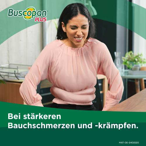 Buscopan® plus, Filmtabletten, Zäpfchen. Wirkstoffe: Butylscopolaminiumbromid, Paracetamol. Anwendungsgebiet: Für Erwachsene und Jugendliche ab 12 Jahren bei krampfartigen Schmerzen bei Erkrankungen des Magens und des Darmes, krampfartigen Schmerzen und Funktionsstörungen im Bereich der Gallenwege, der ableitenden Harnwege sowie der weiblichen Geschlechtsorgane (z. B. schmerzhafte Regelblutungen). Hinweis: Packungsbeilage beachten. Apothekenpflichtig.