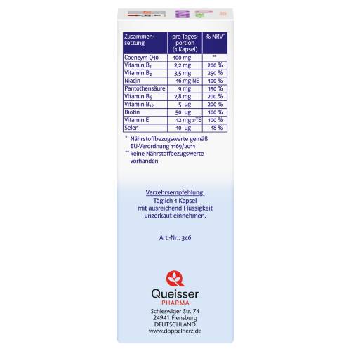 Doppelherz system COENZYM Q10 100 + VITAMINE unterstützt mit B-Vitaminen den Energiestoffwechsel und leistet mit Vitamin E und Selen einen Beitrag für den Zellschutz. Zusätzlich sind 100 mg Coenzym Q10 enthalten.