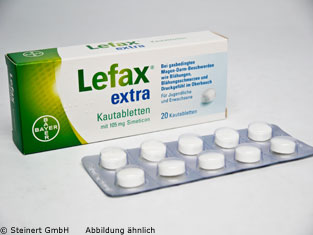 Die Lefax Extra Kautabletten werden zur Behandlung von Blähungen, Druck- und Spannungsgefühlen angewendet. Die Kautabletten enthalten den Wirkstoff Simeticon. Das Simeticon bekämpft übermäßige Gasbildung und Gasansammlung im Magen-Darm-Bereich. Der Wirkstoff verändert die Oberflächenspannung der Gasbläschen. Diese entstehen während der Verdauung und rufen dabei einen schmerzhaften Druck hervor. Durch das Simeticon zerfallen die Bläschen und die Luft im Bauch löst sich auf. Die Lefax Extra Kautabletten helfen bei gasbedingten Magen-Darm-Beschwerden und funktionellen Beschwerden des oberen Magen-Darm-Trakts.