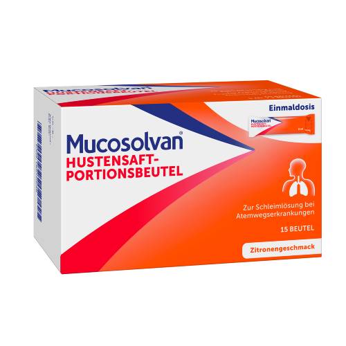 Mucosolvan® Hustensaft-Portionsbeutel 30 mg/5 ml Lösung zum Einnehmen im Beutel. Wirkstoff: Ambroxolhydrochlorid. Anwendungsgebiet: Zur Schleim lösenden Behandlung bei akuten und chronischen Erkrankungen der Bronchien und der Lunge, die mit anormaler Schleimbildung und einer Störung des Schleimtransports einhergehen. Warnhinweis: Enthält Sorbitol, Benzoesäure sowie im Aroma einen geringen Alkoholanteil (weniger als 5 mg/Beutel). Apothekenpflichtig.