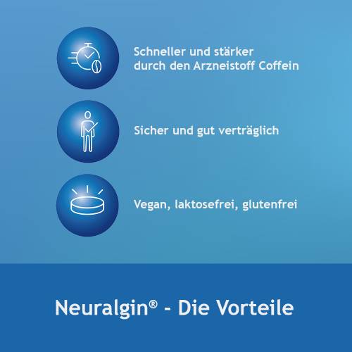 Die Neuralgin Tabletten werden zur schnellen Linderung von mittelstarken Schmerzen angewendet. Die Tabletten enthalten eine Kombination der drei Wirkstoffe Acetylsalicylsaeure, Paracetamol und Coffein. Sowohl die Acetylsalicylsaeure als auch das Paracetamol besitzen Schmerzstillende, fiebersenkende und entzuendungshemmende Eigenschaften. Das zusaetzlich enthaltene Coffein sorgt dafuer, dass die beiden Wirkstoffe schneller und intensiver wirken. Zusaetzlich wird durch das Coffein das Herz-Kreislauf-System angeregt, wodurch Muedigkeit verschwindet. Die Neuralgin Tabletten sind in der Lage Kopf-, Ruecken- und Gelenkschmerzen zu mindern.